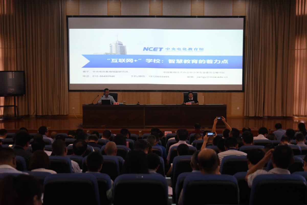 中央电化教育馆副研究员、中国教育技术协会中小学专业委员会秘书长蒋宇作了题为《互联网+学校:智慧教育的着力点》的专题讲座。蒋老师从中国近20年网民规模开始讲解,指出目前中小学校应用系统建设中,基础教育数字资源建设还需要日益完善的现状。他提出,现在要以“互联网+学校”助力智慧教育,加快信息化时代教育变革,从数字校园到智能校园,以智慧教育引领行动实践。因此,学校助力智慧教育要“以人为本”,开拓新思路,用“心”动能进行“应用驱动”,用新发展来推进“机制创新”。
