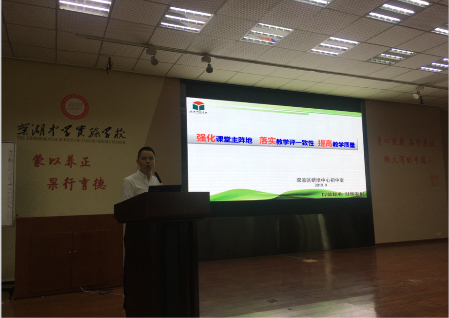 接下来,双流区教育研究与教师培训中心初中室主任匡世国做了题为《强化课堂主阵地,落实教学评一致性,提高教学质量》的专题报告。在报告中,匡主任围绕“以课堂为主阵地,通过推动落实教-学-评一致性,来达成教学质量”的讲话主题,立足各校各项具体数据,通过具体比较分析,提出教学管理的三个有待思考的话题——.教学管理精细化、教师队伍专业化和课堂“教-学-评一致”的达成。在此基础上,匡主任组织与会者从国家层面、省市级层面,认真学习了《中共中央国务院关于深化教育教学改革,全面提高义务教育质量的意见》等文件,强调“强化课堂的主阵地作用,切实提高课堂教学质量”是双流初中教育的当务之急。他指出,初中教育应回到教学原点,落实“教-学-评一致”,强化课堂教学的主阵地作用。他强调“教-学-评一致”是回归教学原点的教学理念、教学原理和教学逻辑;并倡导全区初中学校能借助参与“教-学-评一致”市级课题研究的活动,来提高学校乃至双流初中的教育水平。最后,他援引衡水中学、衡水武邑中学和河北正定中学等学校的管理实例,向与会者提供了一系列“落实精细化管理,细化教育教学措施”的建议。
