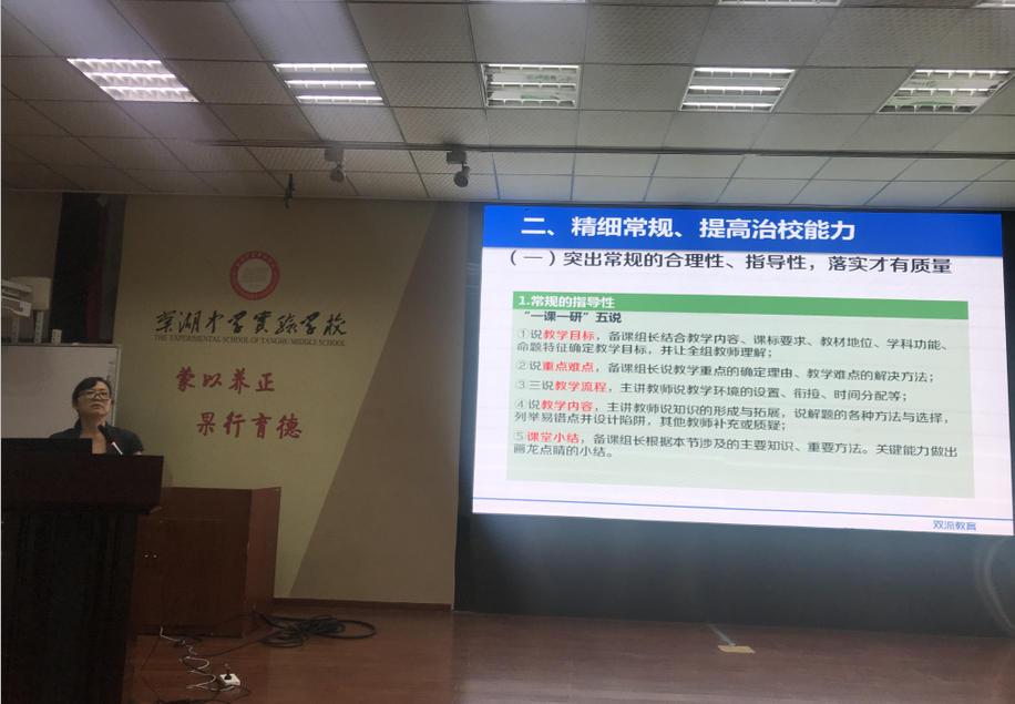 双流区教育局中教科科长廖冬梅在会上就初中教育教学相关工作做安排。她首先要求与会者应认真学习当前国家、省、市发布的文件,提出当前双流初中的办学质量三要求,即“质量为核心,学校有特色,常规要有效”。她特别强调一所学校常规精细化管理的重要性,并指出:“要突出常规的合理性、指导性,落实才有质量;要狠抓课堂常规,体现常规抓手,常抓常新”。最后,廖科长提出了“校长垂范,提高管理水平”的要求,并将会议内容中提及的各项工作进行了布置和强调。