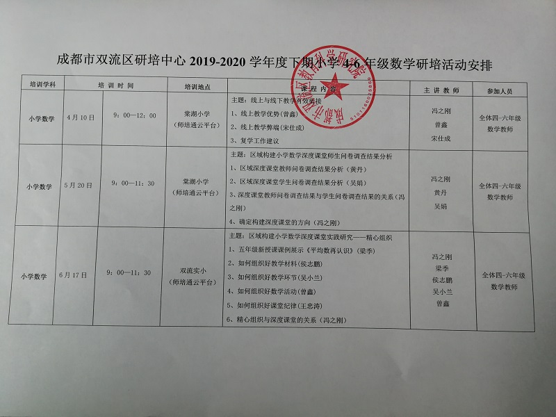 成都市双流区研培中心2019-2020学年度下期小学4-6年级数学研培活动公示