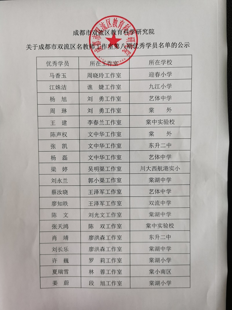 成都市双流区教育科学研究院关于成都市双流区名教师工作室第八期优秀学员名单的公示