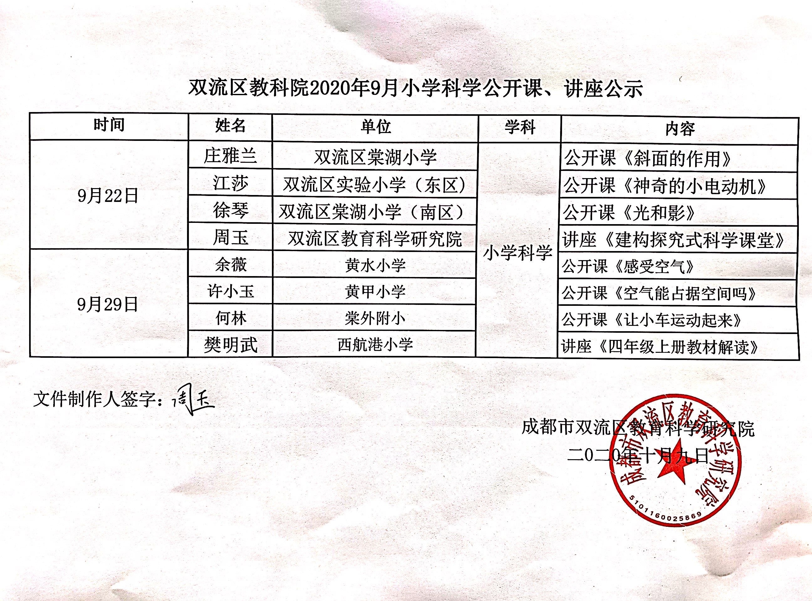 双流区教科院2020年9月小学科学公开课、讲座公示