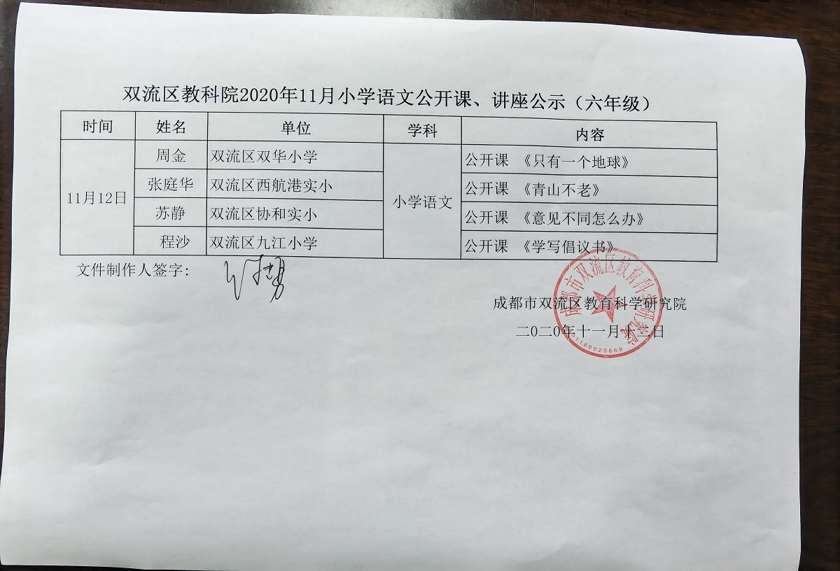 双流区教科院2020年下半年小学语文六年级公开课证书