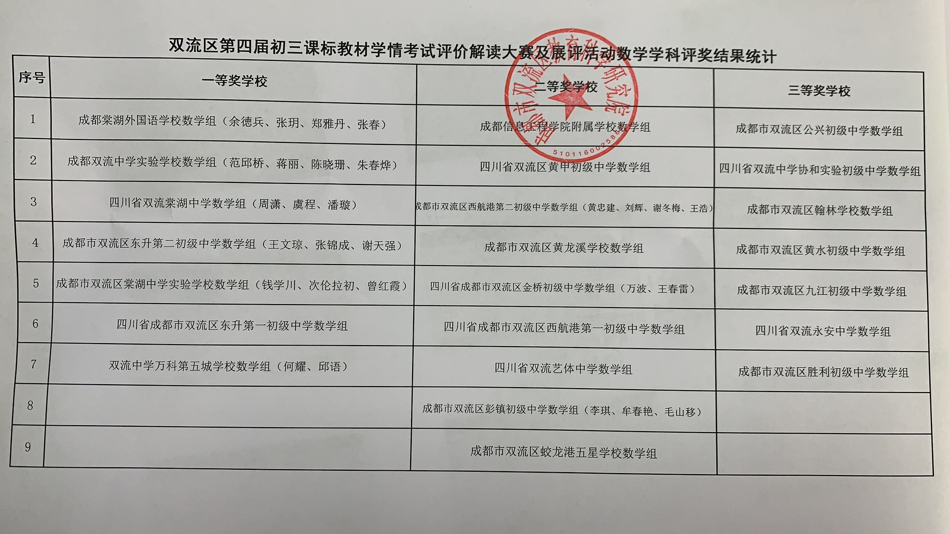 双流区第四届初三课标教材学情考试评价解读大赛及展评活动数学学科评奖结果