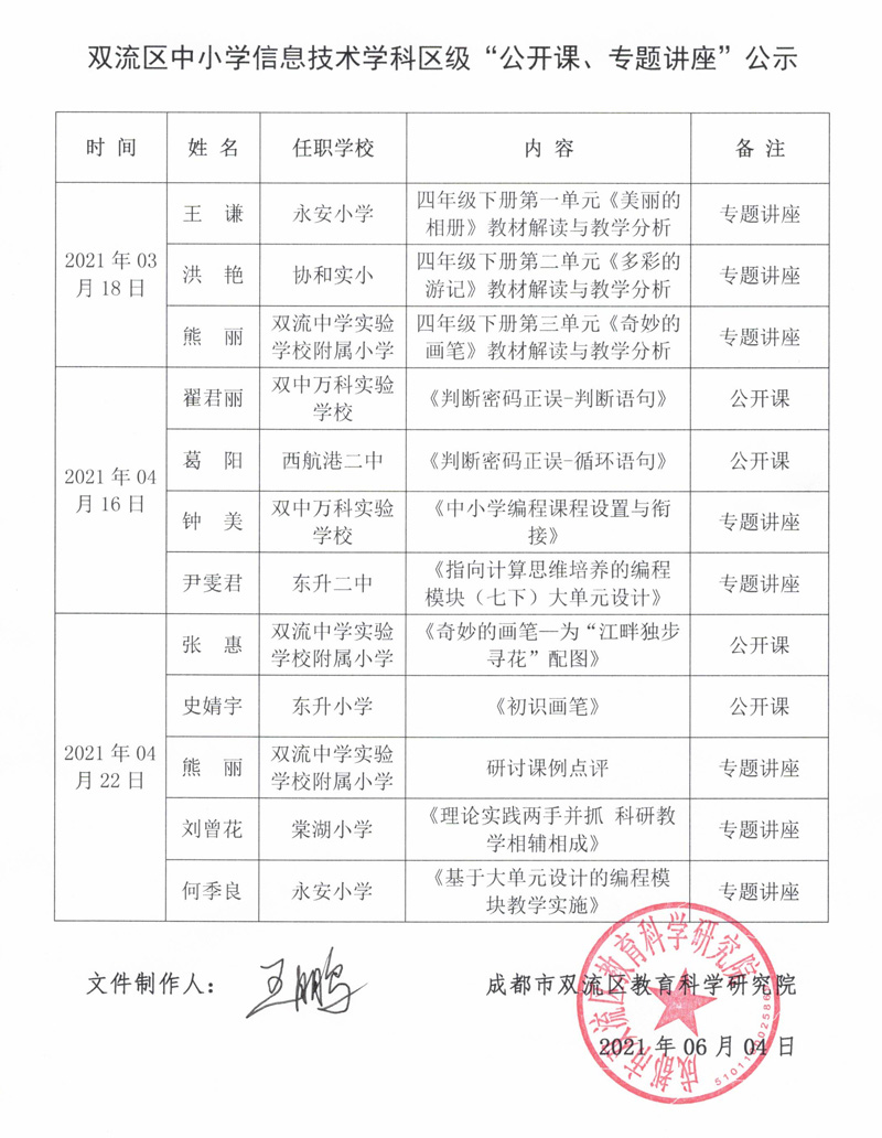 双流区中小学信息技术学科(2021年3-4月)区级“公开课、专题讲座”公示