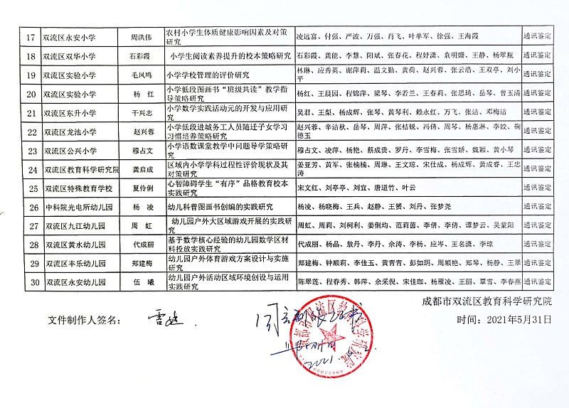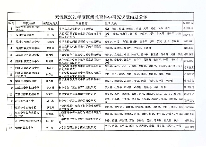 双流区2021年度区级教育科学研究课题结题公示