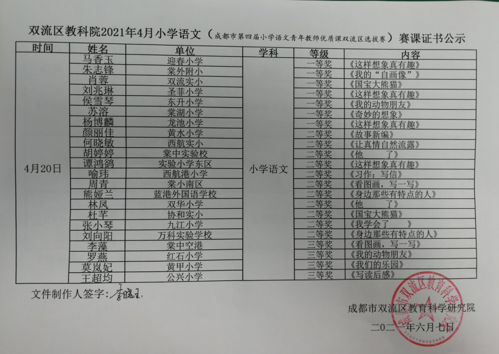 成都市第四届小学语文青年教师优质课双流区选拔赛