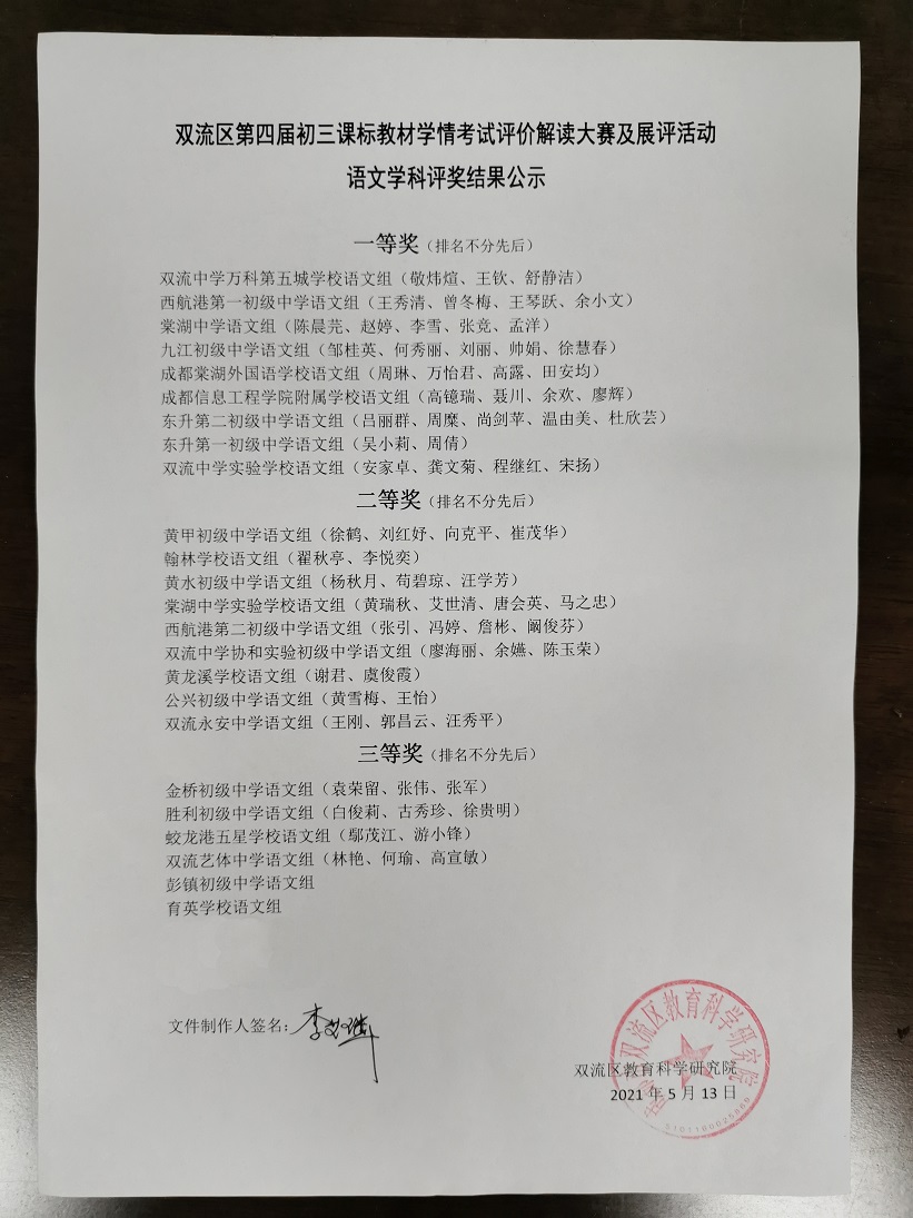 双流区第四届初三课标教材学情考试评价解读大赛及展评活动语文学科结果公示