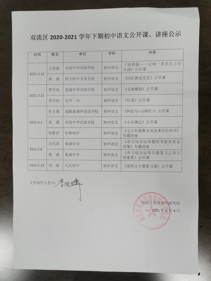 双流区2020-2021学年下期初中语文公开课、讲座公示
