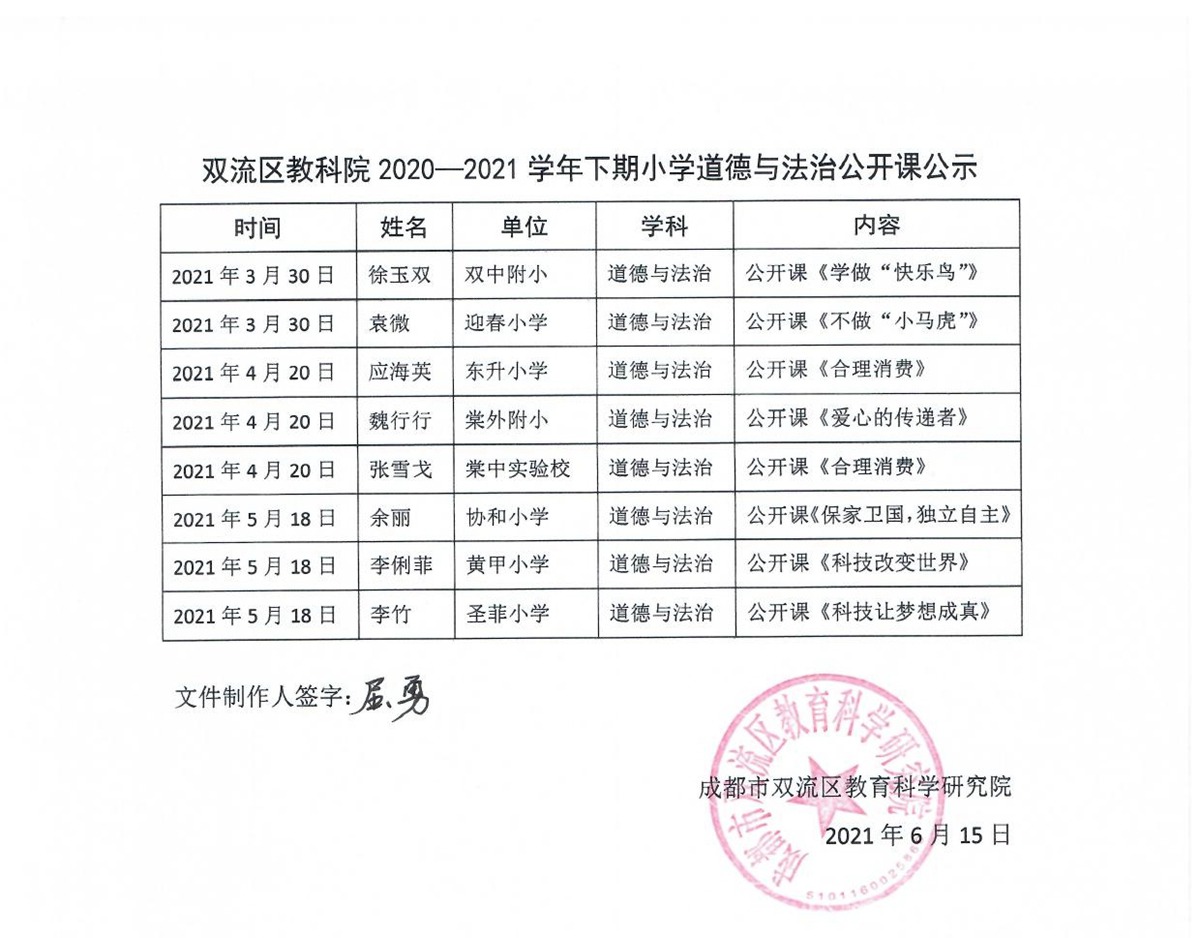 双流区教科院2020—2021学年下期小学道德与法治公开课公示