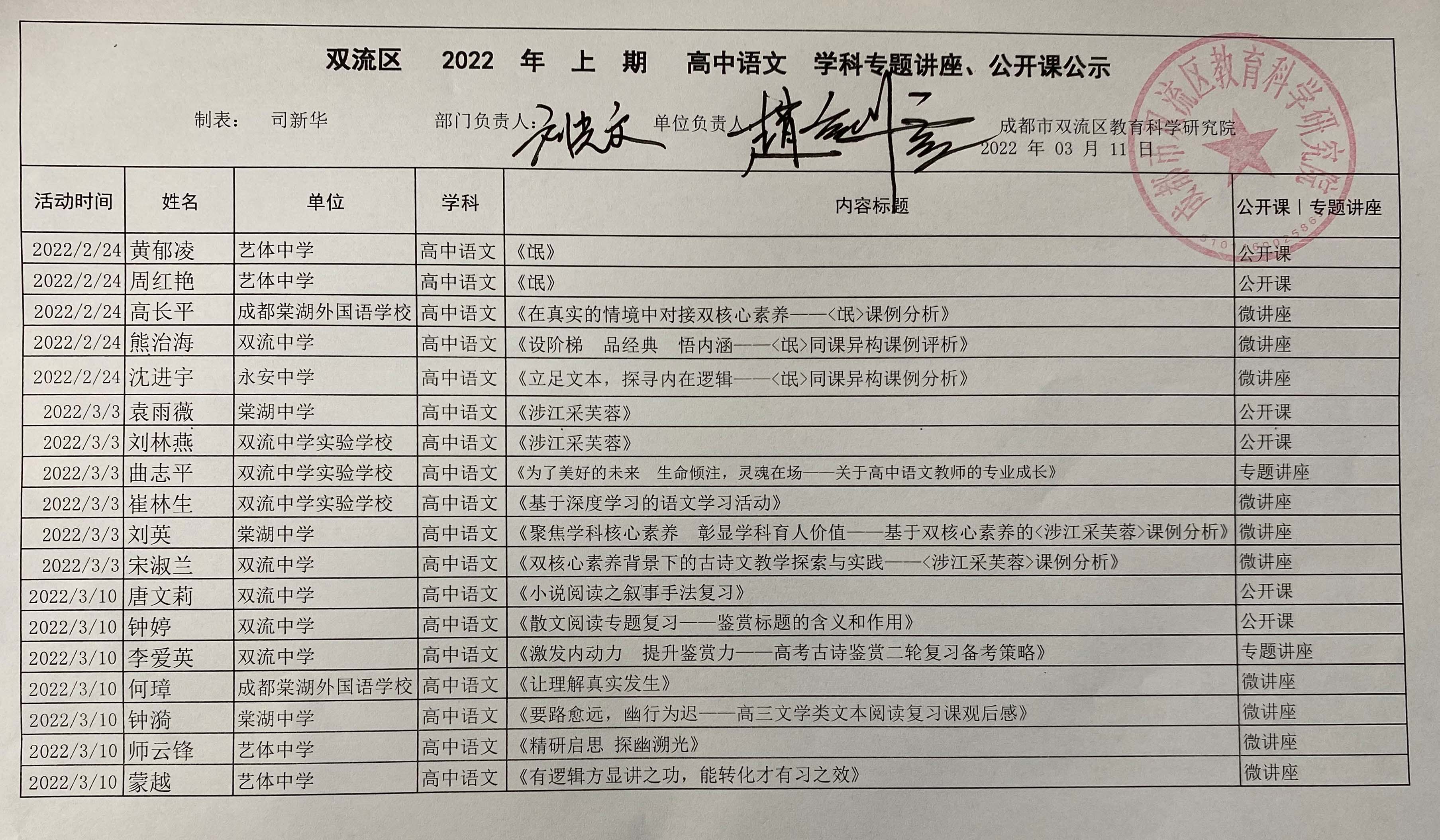 2022上半年 双流区高中语文科教研活动 上课、讲座统计公示20220313