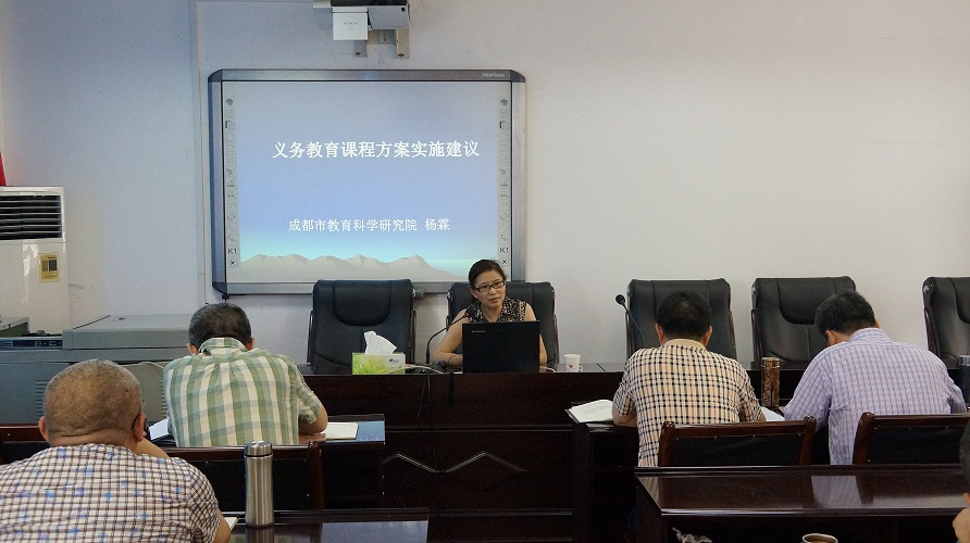 9月1日下午,成都市教科院基教所杨霖副所长做了题为《义务教育课程方案实施建议》的讲座。她从对国家和省级课程设置方案和相关指导性意见的解读和执行,明确学校课程改革主要任务两大方面开展了培训。