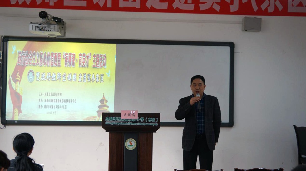 2016年11月18、22日下午,“双流好教师宣讲团”走进东升街道办宣讲活动在实验小学东区、东升一中成功举行。活动由双流区教育局主办、双流区研培中心承办、实验小学东区、东升一中协办。区教育研究与教师培训中心副主任、好教师宣讲团团长谢祖福出席并主持了宣讲活动。实验小学东区和东升一中教职员工共170人参加了宣讲活动。