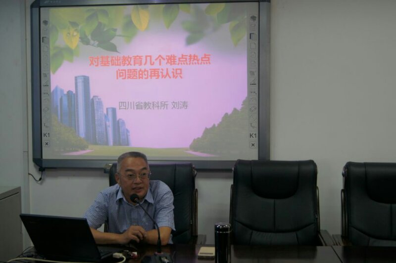 在报告交流中,刘涛所长结合他对教育工作的理解提出:教育应该是越来越来轻松的过程;学生人生起跑线不是在学校,而是在家庭,强调重视家庭教育的重要性;教育的基本理念应该是有教无类、因材施教、知行结合、尊重包容、终身学习、人人成功;学生自主幸福成长的重要基础是培养学生的良好习惯,培养学生的健康体质,培养学生的自学能力,培养学生的兴趣特长。他认为良好习惯是立人之本,健康体质是立命之本,自学能力是立生之本,兴趣特长是立业之本;他提出在深化基础教育课程改革的过程中需要在目标上,处理好核心素养与三维目标的关系,坚持继承发展,循序渐进等原则;在方法上,主张探究式教学法;在内容上,突出思维训练和跨学科知识的整合;在结构上,利用信息技术改变师生在课前、课中和课后的教学行为,把提高教学质量的重心前移。报告中刘涛所长还结合四川全省基础教育管理干部、校长和教师关于教师培训开展的问卷调查数据分析报告,详细分析了为什么一线教师对教师培训满意度不高这一问题。最后刘涛所长还从新普通高中课程改革面临的观念问题、技术问题、制度问题、条件问题等角度提出了,普通高中应对新高考的五点对策:第一加强学习,树立必改的信心。第二问题导向,列出问题清单逐一回应。第三重构制度,建立适应新高考的学校管理框架体系。第四循序渐进,摸着石头过河。第五整合力量,协同攻关。