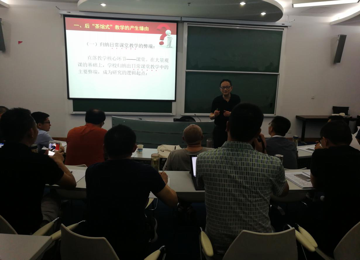 7月15日是2018年双流区学校课程领导力提升高级研修班在华东师范大学集中研修学习的最后一天。上午9:00,上海静安区教育学院附校张人利校长给我们带来了第十二讲——题为《后“茶馆式”教学模式的理论和实践》的讲座。张文利校长现任教育部中学校长培训中心兼职教授,华东师范大学“特聘教授”,上海市名校长培养基地主持人,上海市特级校长。他今天介绍的课题《后“茶馆式”教学》获教育部“全国基础教育课程改革教学研究成果”一等奖,是我国教学科研的一项重要成果。