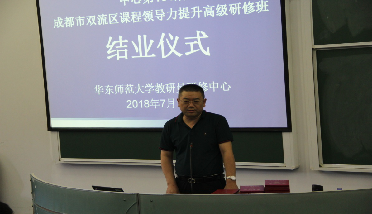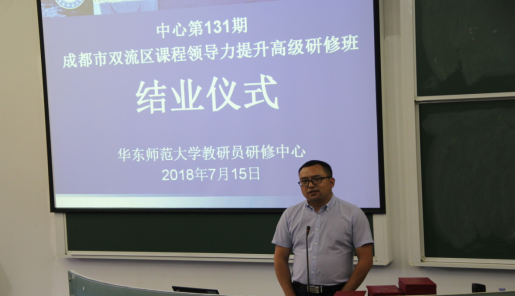 会上,首先由学员代表东升一中盘光毅副校长做了发言。他代表全体学员感谢了华东师范大学对本次集中研修的精心安排和双流区教育局、区研培中心提供给各位学员的宝贵学习机会。他表示经过此次学习,收获大,感受多,并代表全体学员们表态一定把此次研修学习到的关于课程改革、课程实施等新观念带回双流,带回自己的工作岗位,为双流区的教育添砖加瓦。