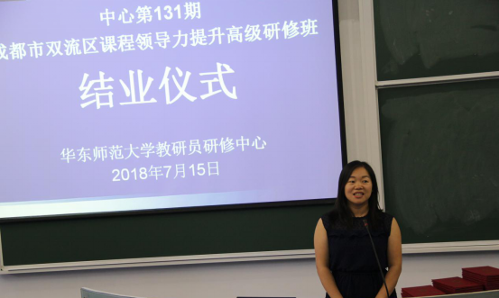 华东师范大学的周文叶教授随后代表校方发表讲话。她首先祝贺双流区课程领导力提升高级研修班全体学员在集中学习阶段顺利结业,肯定了大家的学习态度和学习效果。周教授表达了授课教师和学员成为朋友,建立联系的欣慰,并希望学员们能把研修的状态带回到工作中。她的一句,“作为‘母校’,欢迎大家常回家看看”,让学员们倍感温馨和感动。