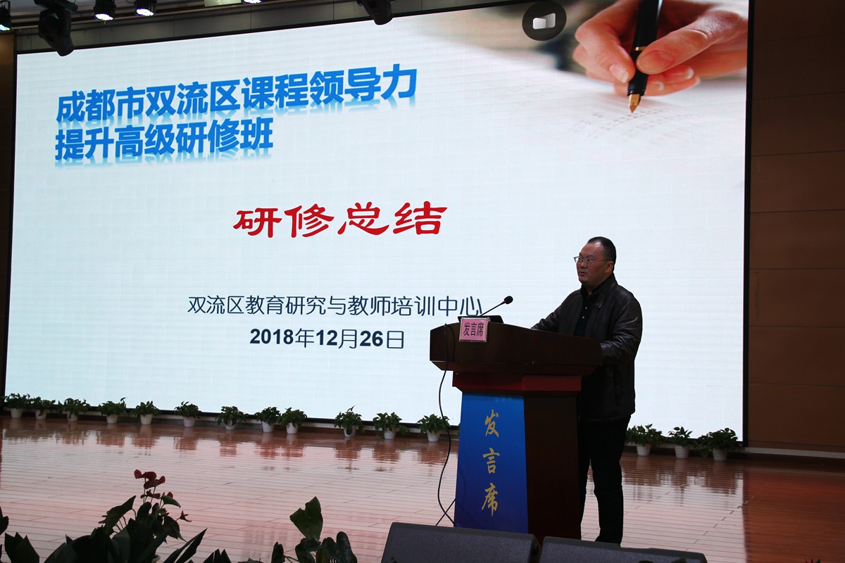 首先,区研培中心副主任赵剑云就本次培训情况作了总结发言。他先介绍了此次课程领导力提升研修培训的基本情况——研修目标明确,研修模式鲜明;研修形式多样,学习内容丰富。接着肯定了参训学员老师们的学习情况——认真参与实践,撰写学期课程纲要;积极参与研讨,分享评析作业;研修效果显著,研修成果丰富。并在此基础上向全体学员提出进一步的要求和希望,希望大家用时间和实践来深入理解专家的思想和智慧,保持对教育的执着和情怀,坚定地行走在课程改革的路上,为双流教育品质提升贡献自己的力量。