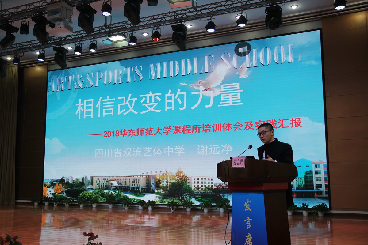接着,参加了此次培训的六位老师——艺体中学教务主任谢远净、九江初中教务主任邹桂英、棠湖中学学导处副主任杨海波、西航一中团委书记崔倩、永安中学教科室主任祝君、区研培中心研培员杜尚兵分别与大家分享了他们参加此次培训的感受,提出了理论运用于实践的困惑与反思,并向区研培中心及华东师大的各位专家表达了诚挚的感谢。