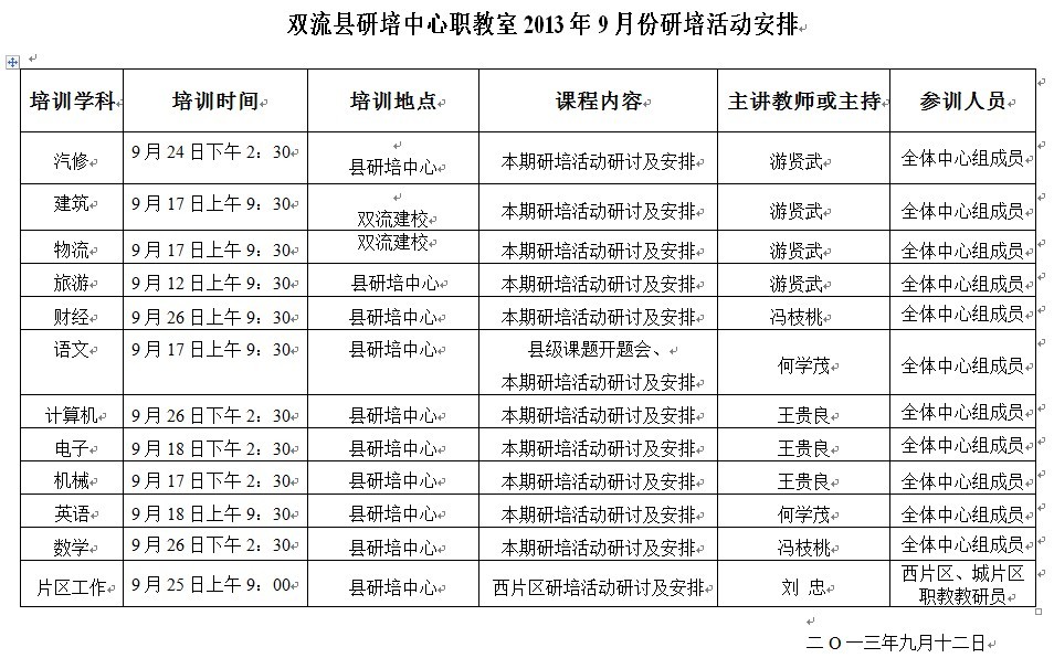 双流县研培中心职教室2013年9月份研培活动安排
