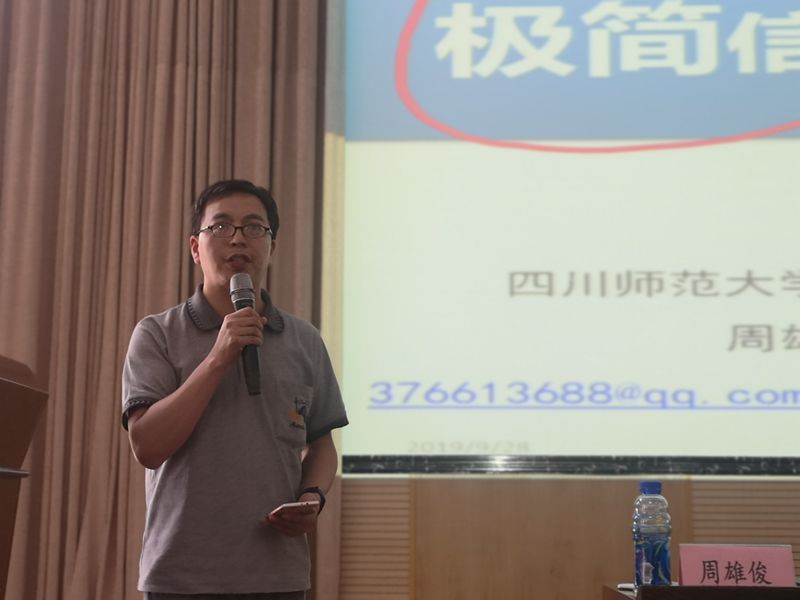 下午13点30分,四川师范大学教授周雄俊到场来为大家做了题为《极简信息技术的教学运用》的精彩讲座。周教授首先结合《教育信息2.0行动计划》文件的基本目标“2022年基本实现‘三全两高一大’”这几个方面,讲解了信息技术在教育教学应用中举足轻重的作用。然后,在他风趣幽默的语言下,新教师们一起用手机跟着他从“信息技术的工具性应用”、“信息化教学的环境构建”、“信息化教学资源的支持”和“课堂教学的结构性变革”,循序渐进地走进了信息技术的神奇世界。周教授详尽的与大家探究了如何在“互联网+”的新时代背景下,让信息技术与教育深度融合来促进学校的教育教学工作。同时向老师们介绍了多款实用性强、简单易操作的教学工具,期间老师们不时发出阵阵惊叹声和掌声。