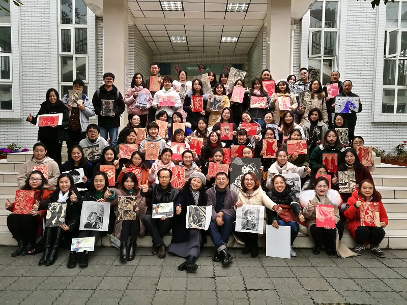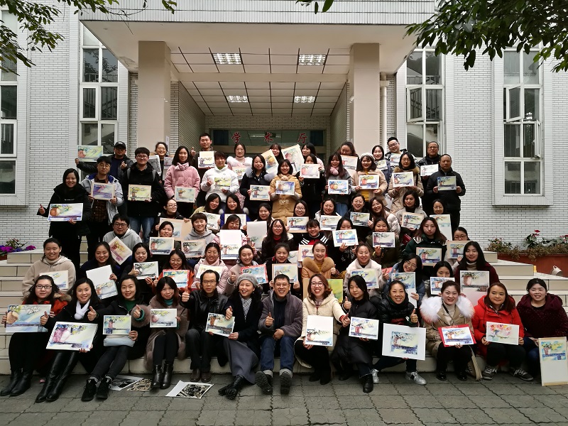 根据美术教学实际和美术教师们的需求,本次培训以版画和水彩画技能实践为主。我们荣幸地邀请到了正高级教师、四川省特级教师、中央美院国培专家、成都市教科院美术教研员辜敏老师和四川省特级教师、中国少儿版画研究会副会长闫华老师前来进行专业培训指导。两位专家在各自的领域结合教学开展了多年的实践探索,他们将自己研究的过程、内容、方法和取得的成果作了充分的分享,引起了参训老师的强烈共鸣,大家受益匪浅。