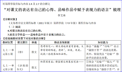 本次教研活动就以初中语文教研员李艾璘老师率先完成的对《义务教育语文课程标准(2011年版)》第四学段(7-9年级)课程目标与内容(二)阅读4.“对课文的表达有自己的心得”和7.“欣赏文学作品……品味作品中富于表现力的语言”的分解为例,向老师们具体介绍该子课题工作的工作。
