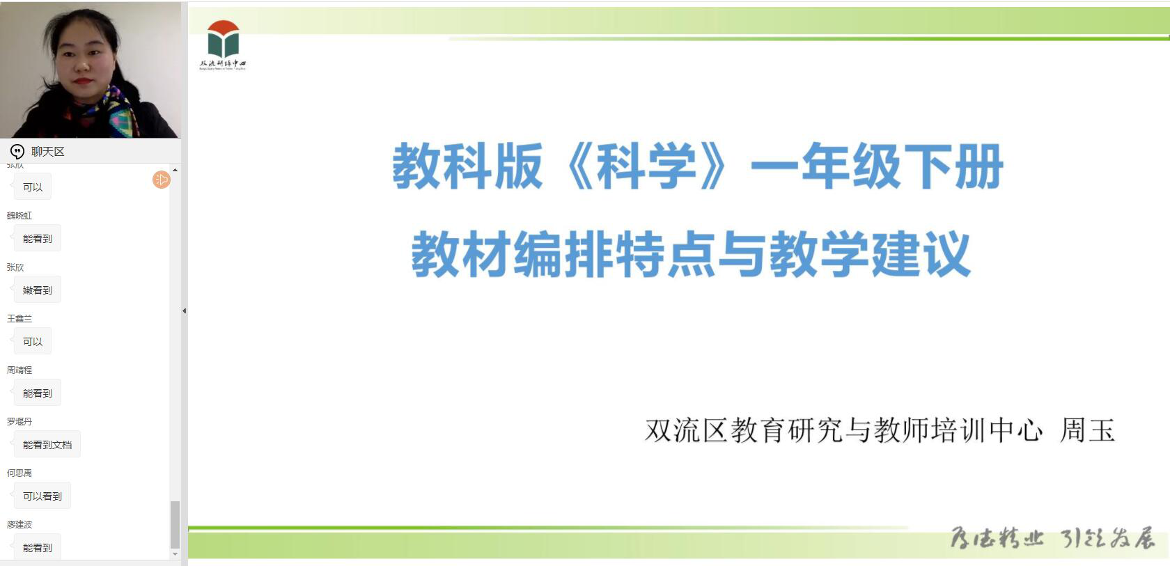 在这场全国人民共同参与的抗击疫情特殊时期,双流区小学全体教师从未停歇教书育人的脚步。根据国家教育部,省教育厅,市、区教育局“停课不停教,停课不停学”的相关要求, 2020年3月17日,双流区研培中心科学研培员周玉老师组织全区小学科学教师进行了线上一、二年级教材培训活动,全区科学教师参加了此次培训。