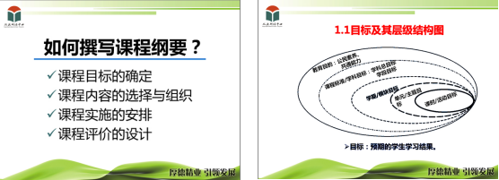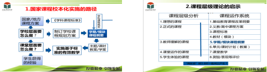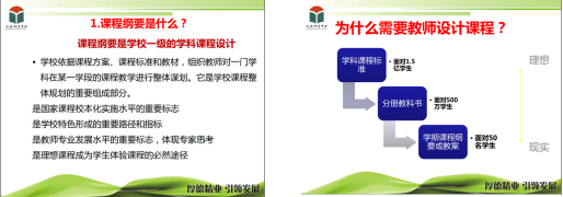 第一,“学期课程纲要”的重要性,也就是为什么需要课程纲要。讲座中从“国家课程校本化实施的路径”、“课程层级理论的启示”、“现实的要求与困惑”三个角度结合图形直观的阐明了其中的逻辑关系,使“学期课程纲要”的重要性得以凸显。并且在“现实的要求与困惑”的讨论中点明了“教学评一致性”对广大教师的重要意义,而基于标准的教学评一致的实施途径之一就是研制课程纲要。通过这样层层分析切实的使教师们认识到“学期课程纲要”的重要性。从而自然引出了第二个话题何为“学期课程纲要”?