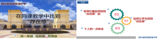棠湖中学黄飘逸老师以在网课教学中找到“存在感”为主题,从寒假准备、备课组教研、教师备课、学生课堂与落实等角度,分享了老师如何找到“存在感”,如何让学生找到“存在感”的方法,希望老师们都能在虚拟的云端教学中找到师生真实的存在感。