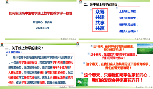 最后,杜尚兵老师以“如何提升线上教学的教学评一致性”为主题,为在线教学提出具有可操作性的建议。他谈了线上教学的认识和利弊,认为线上教学是众筹、共建、共享、共赢的教学,希望老师们做到眼中有“人”,心中有“爱”,脑中有“材”,嘴中有“礼”,手中有“法”,上好线上课程,帮好困难学生,说好抗疫故事,做好人民教师。