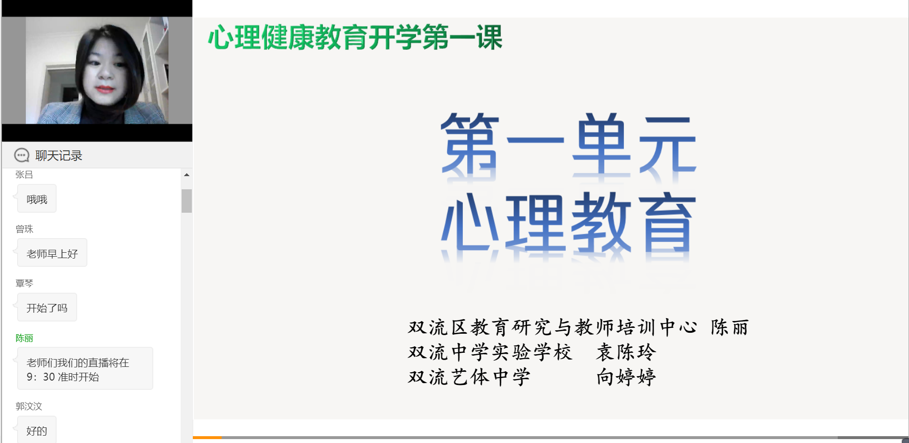 2020年4月3日课题组利用双流区继续教育“师培通”平台开展了全区第一场专题直播培训。本次直播培训的主题是“学生复课后心理维护第一课——心理教育”。