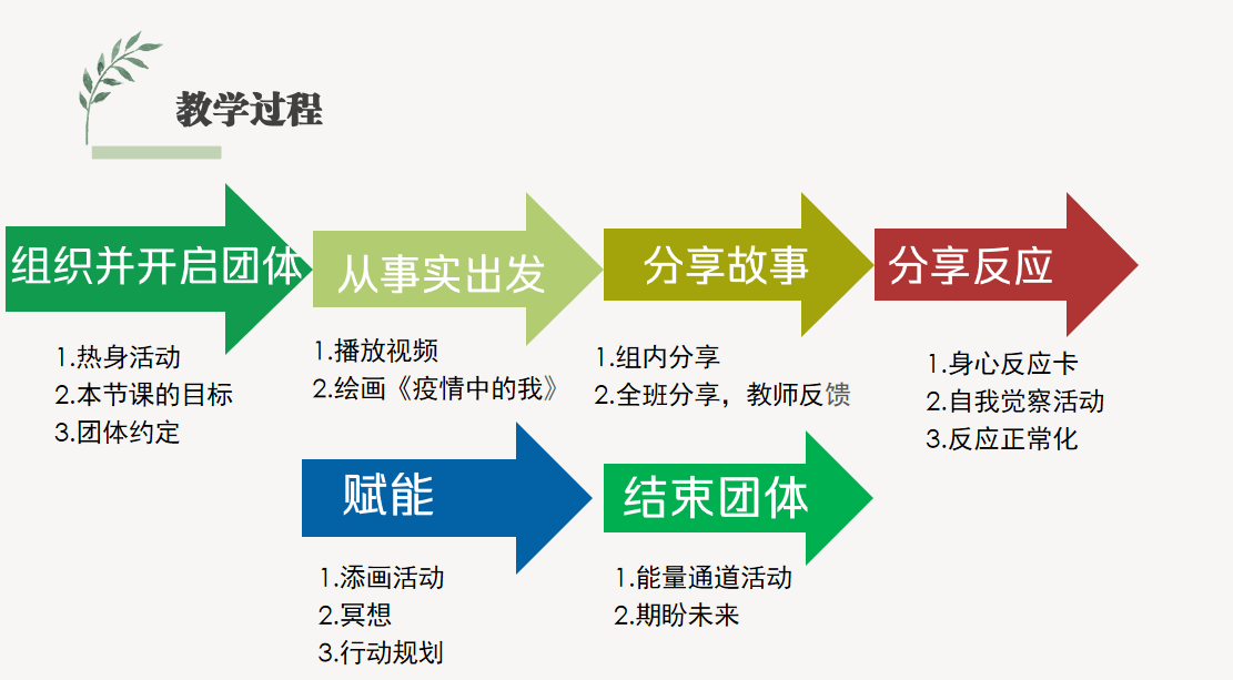 这是本课题的第一单元的主题,课例以心理急救六步法、危机干预、心理复原力、社会支持系统等理论为支撑,以疫情现状、即将复学的现实因素以及学生问卷调查为背景设计而成,共包括一个详细课例——疫情下的心理教育,以及两个补充课例——意外伤害事件后的心理教育、亲友离世后的心理教育。详细课例部分,严格按照六大步骤,结合表达性艺术治疗、冥想等心理技术设计活动,实现高结构和可复制的教学设计。