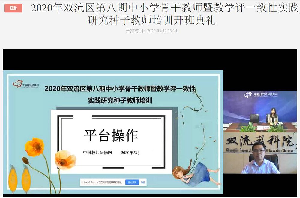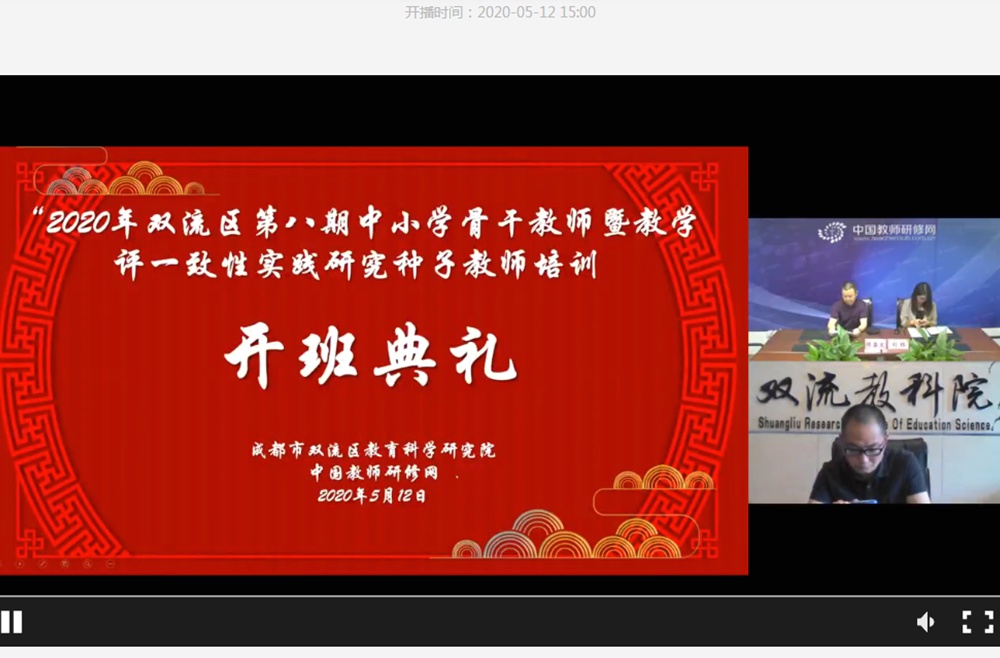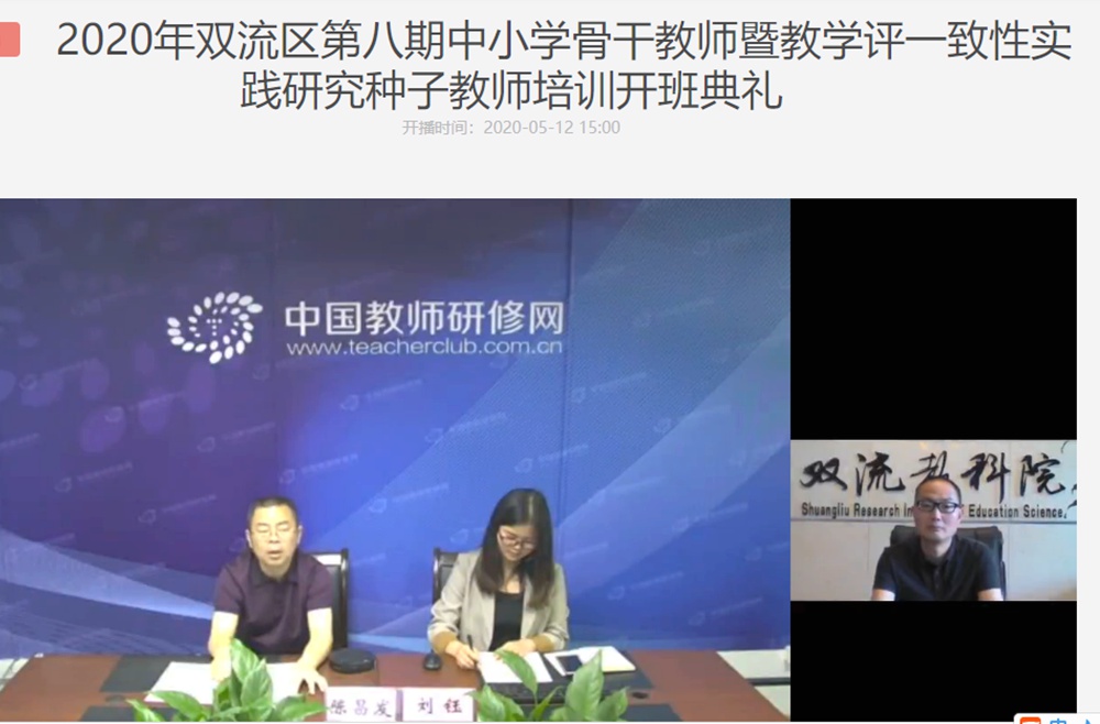 2020年5月12日下午,成都市双流区第八期中小学骨干教师暨“教学评一致性”实践研究种子教师培训班开班典礼在中国教师研修网的会议平台上顺利举行。中国教师研修网副总编陈昌发、双流区教科院副院长赵剑云出席开班典礼,区第八期中小学骨干教师研修班的275名学员参加了这次活动。开班典礼由研修网教务编辑刘钰主持。