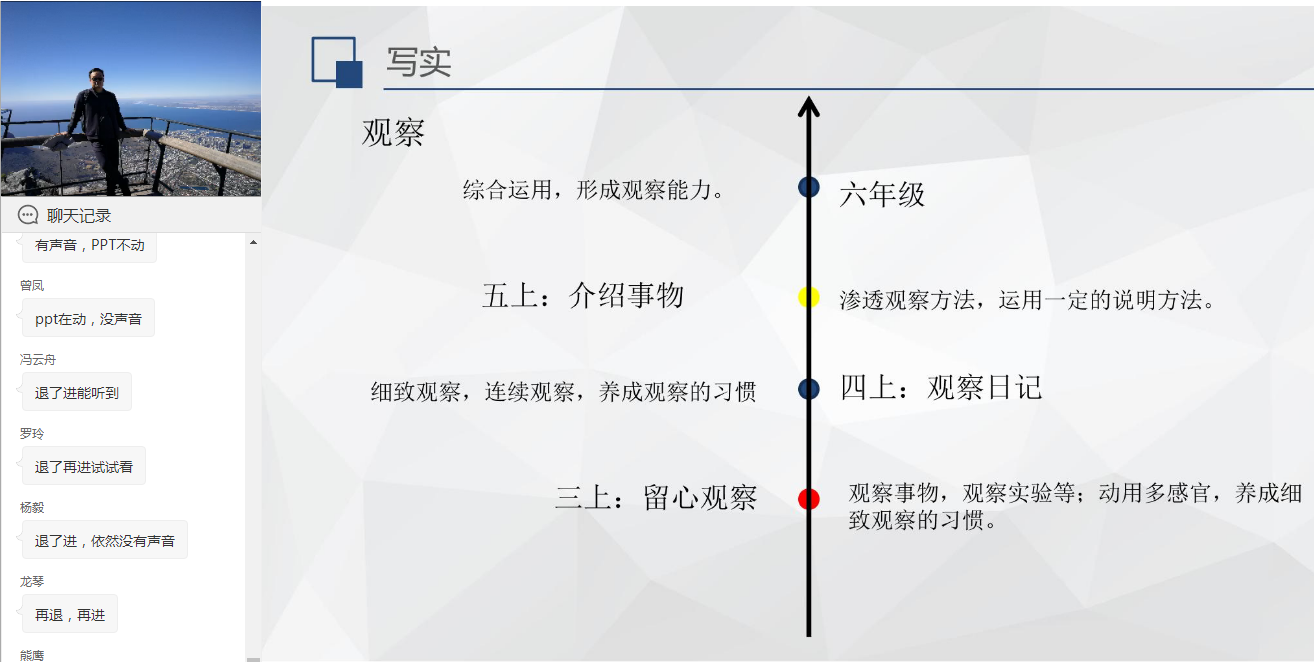 (3)小学高段和初一初二因为4月中下旬返校开学,主要进行的是线上教学与线下教学如何衔接的相关指导研培活动,比如:《迎接返校暨初中语文新课标分解系列专题二》、《公民的基本义务》、《8年级英语学生自主阅读能力提升之二》、《7年级英语学生学习能力提升之二》、《小学数学线上与线下教学衔接》、《(4-6年级)基于支架的语文习作教学序列化建构》等。