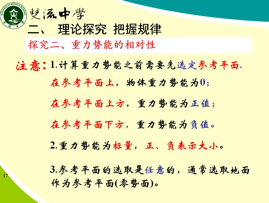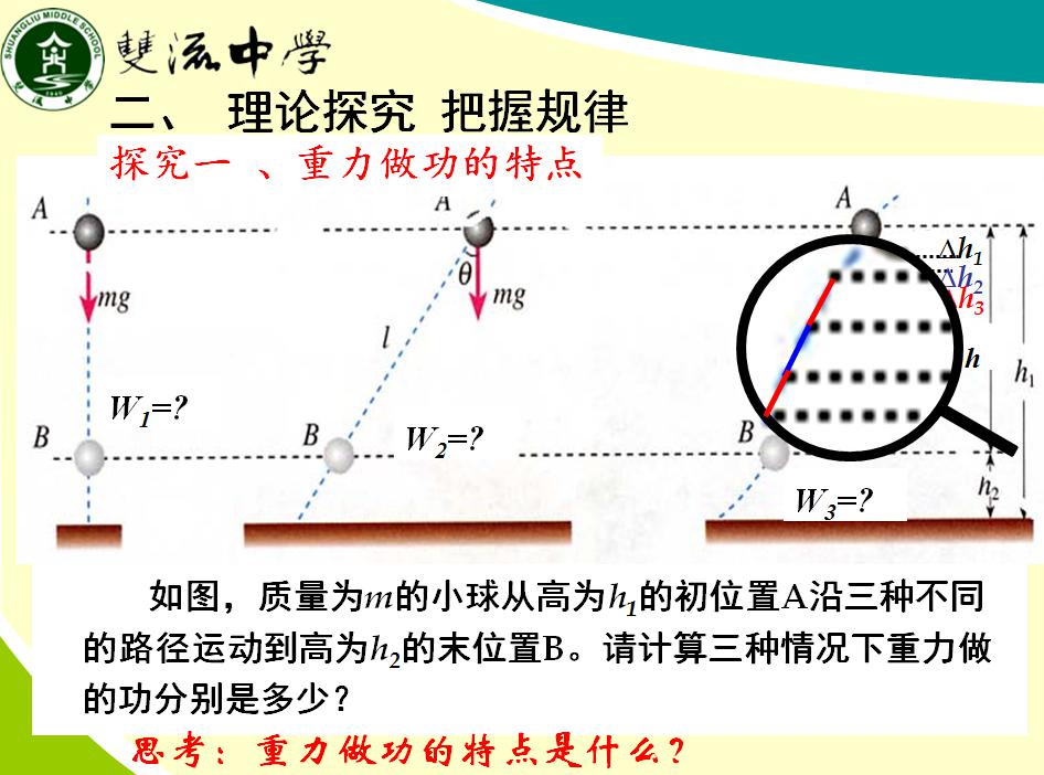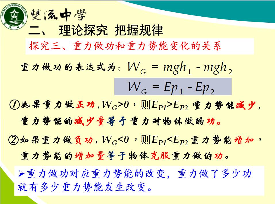第一部分中,刘老师运用生活实例使学生感知重力势能,让学生自主设计实验得出重力势能大小的定性分析,紧接着自然过渡到当下热门话题高空抛物的危害,让学生道德情感得以升华。第二部分中,设计了四大探究:一 、重力做功的特点;二、重力势能的相对性;三、重力做功和重力势能变化的关系;四、重力势能的系统性。最后部分让学生学以致用,巩固提高。