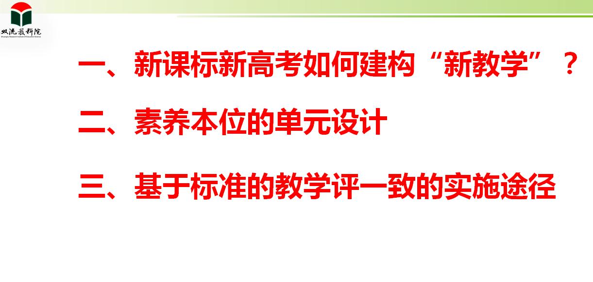 本次教研活动的主题是《“教学评一致性”的教学设计——教学方案、活动设计及效果评价》,培训主要内容为:1. 新课标新高考如何建构“新教学”;2. 素养本位的单元设计;3. 基于标准的教学评一致的实施途径。