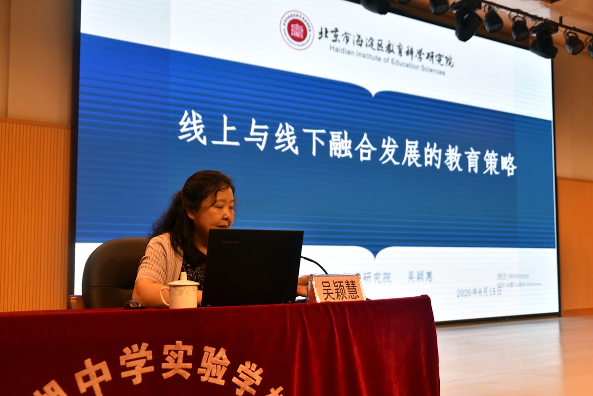 8月22日上午9时,培训活动正式开始。北京市海淀区教育科学研究院院长吴颖慧作了《线上与线下教育融合发展的实践路径》的专题讲座。吴院长结合丰富的案例从互联网深刻改变教育、人工智能深度影响教育、现代技术重塑教育环境和教育融合发展的实践选择等四个方面给大家分析了当前线上线下教育融合的现状、问题、经验和发展方向。