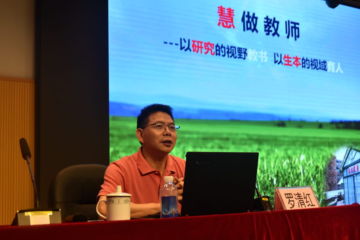 8月22日下午,成都市教育科学研究院院长罗清红作了《慧做教师——以研究的视野教书,以生本的视域育人》的专题讲座。罗院长结合自己在成都七中当教学副校长和在市教科院当院长的工作经历,给大家交流了如何去“慧”做教师。他从物质和精神两个方面分享了自己对“道”的理解和对“教师是人类灵魂工程师”的认识。他通过分析月考的合理性,强调了知识结构的重要性。他结合自己当教师的案例,进行了教学、教育和教材之辩。