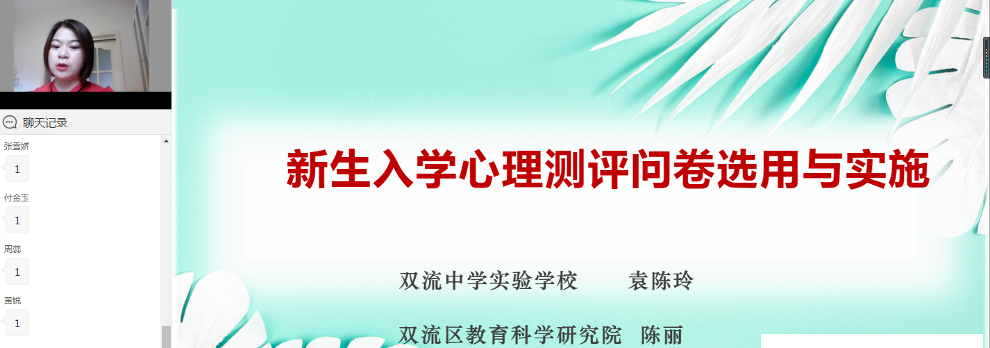 为了更好地帮助学校把握新生的总体心理健康状态,促进学生的心理适应,2020年9月15日上午9:30-11:30,区教科院利用双流区教师培训智能云平台开展了2020-2021学年度的第一场心理健康教育专兼职教师专题培训。培训聚焦“新生入学心理测评问卷选用与实施”,邀请了双流中学实验学校的袁陈玲老师就学校新生入学测评工作做了详细的经验介绍。