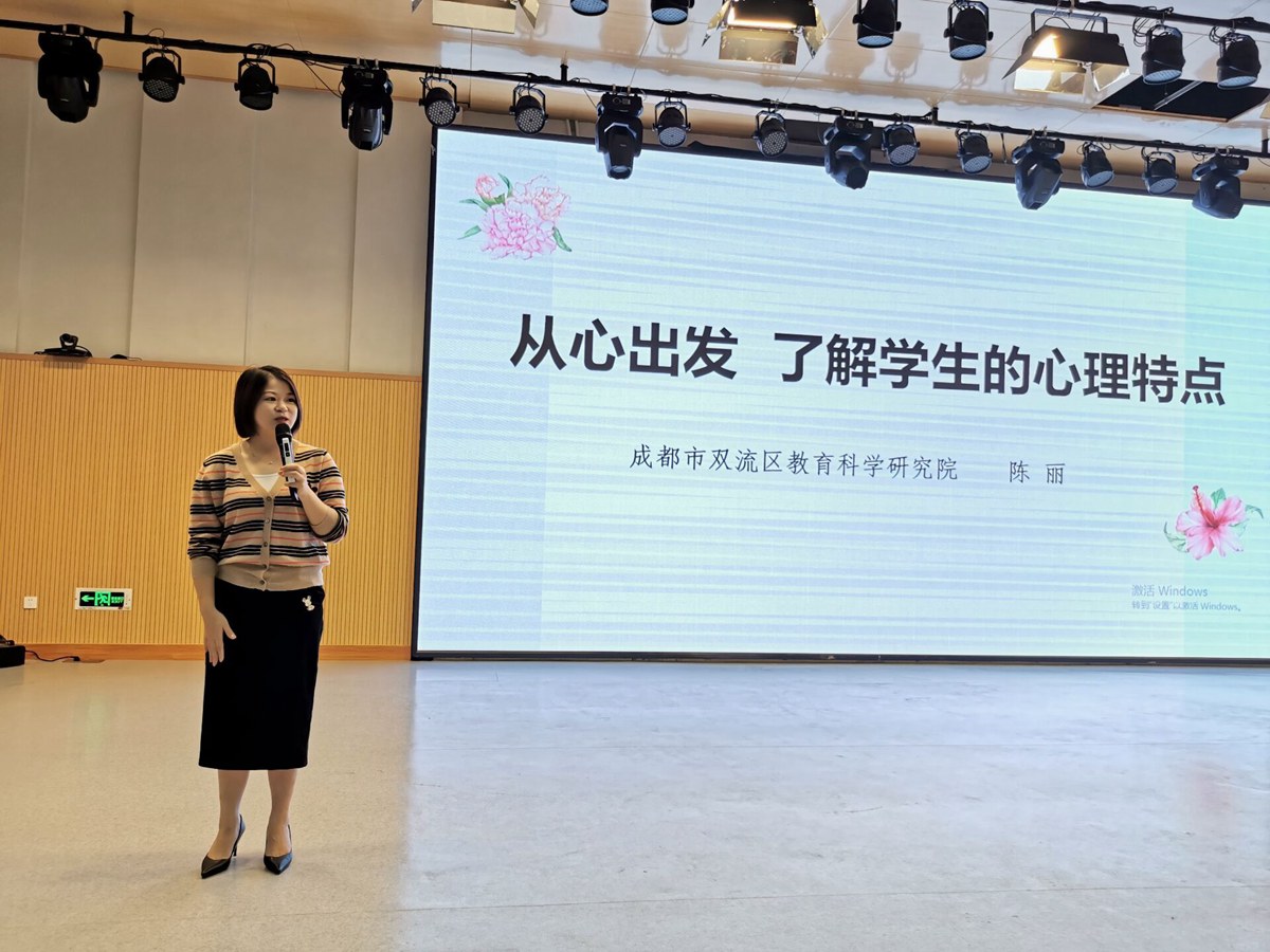 上午9:00,双流区教育科学研究院办公室副主任陈丽老师为大家带来了题为《从心出发,了解学生的心理特点》的专题讲座。陈老师结合自身从教经历,及自己家庭的日常,用幽默风趣的语言向我们讲述了为什么要了解学生心理特点、如何了解以及了解学生心理特点的重要性,让大家明白了教师不只是要说,更多的要去听,从点点滴滴细心观察了解学生的内心世界,走进他们的内心,才能更好的开展教育工作。在此基础上,陈老师以“积极心理学”为蓝本提出了作为教师看待学生的方法:优点总比缺点多,缺点都是有用的。这为大家在日常工作中解决学生问题提供了价值依据。通过陈老师生动的案例讲解和专业的心理学知识分享,大家更深刻的明白了解学生心理特点的重要性和必要性。