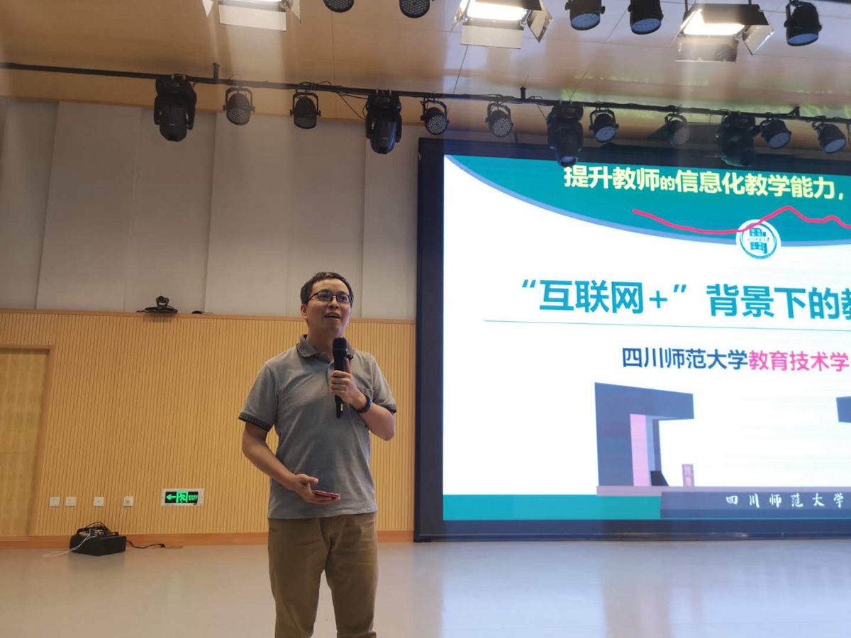 下午13:30,四川师范大学教育技术学教授周雄俊为大家作了题为《提升教师的信息化教学能力,“互联网+”背景下的教学新生态》的专题讲座。周教授首先结合《教育信息2.0行动计划》文件的基本目标“2022年基本实现‘三全两高一大’”这几个方面,讲解了信息技术在教育教学应用中举足轻重的作用。然后,在他风趣幽默的语言下,新教师们一起用手机跟着他从“信息技术的工具性应用”、“信息化教学的环境构建”、“信息化教学资源的支持”和“课堂教学的结构性变革”,循序渐进地走进了信息技术的神奇世界。周教授详尽的与大家探究了如何在“互联网+”的新时代背景下,让信息技术与教育深度融合来促进学校的教育教学工作。同时向老师们介绍了多款实用性强、简单易操作的教学工具,期间老师们不时发出阵阵惊叹声和掌声。