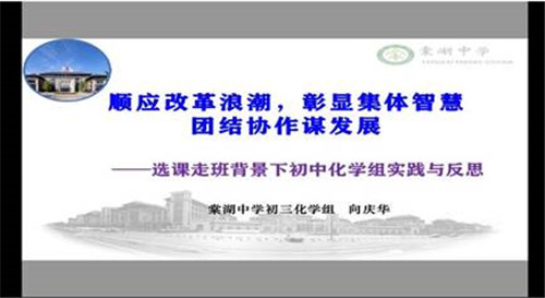 首先,向老师结合棠湖中学走班背景下分享“选课走班下的化学组的实践与反思”,主要从团队建设、选班情况介绍、实践探索、实践反思这4个方面进行讲述。这里面不仅介绍了备课组团队的组建历程,也展示了组内的合理分工及新老教师搭配,体现出团结性和科学性。棠湖中学进行的“选课走班制”是一个创新而大胆的事情,向老师也为大家展示了他们是如何积极的探索走班教学模式,如分A、B层备课、取消班委而只确定课代表、利用学生自习课进行辅导、开展趣味化学活动,并以图片、文档的形式为大家直观展示。实践探索尽管坎坷,但备课组也在不断的反思与摸索中前进,在2020年的中考适应性考试中也取得了不错的成绩。