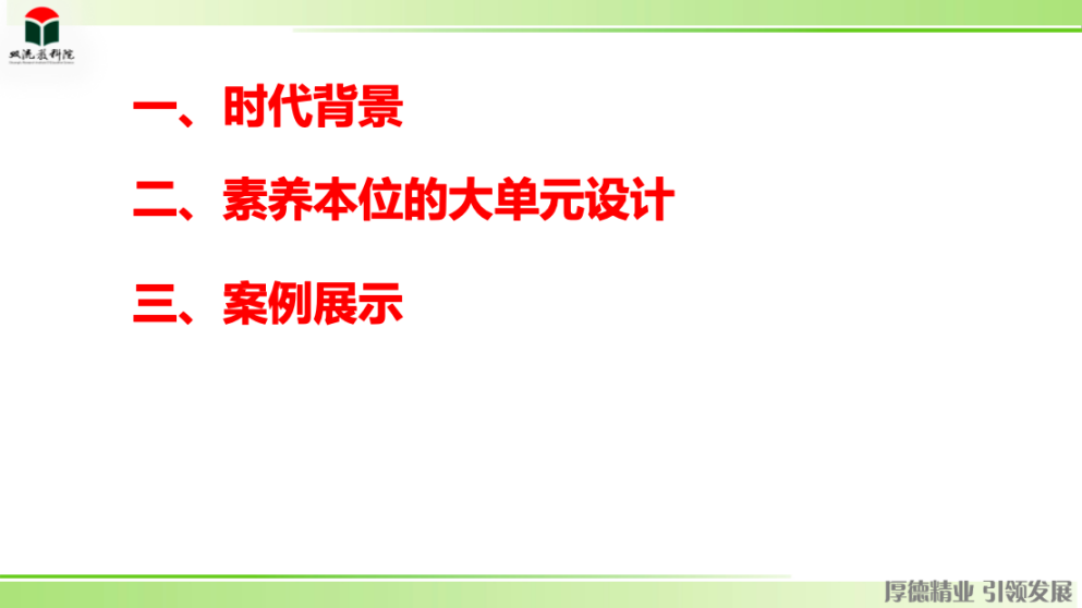 讲座第一部分是大单元教学设计的时代背景。随着课程标准的修订和高考制度的改革,高中育人目标从知识本位转向了素养本位。新目标要求老师的教学设计单位从“一个一个知识点”转向“在什么情境下运用什么知识解决什么问题或完成什么任务”。这样一个教学设计单位,用课程的话语来说,就是单元。