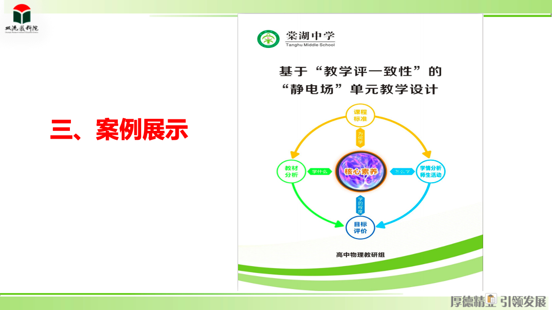 讲座第三部分是案例展示。滕老师以棠湖中学完成的《基于“教学评一致性”的“静电场”单元教学设计》为例说明了如何设计素养本位的大单元教学。该案例分为课标、教材分析,单元学科素养,学生学情分析,单元活动设计,单元评价设计和单元设计反思等六个方面。