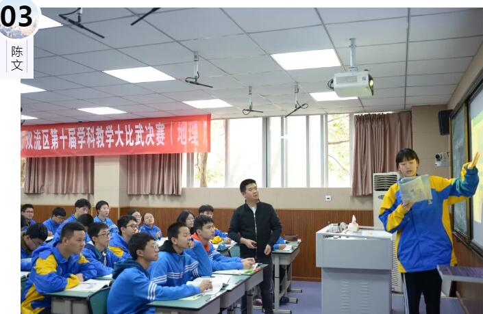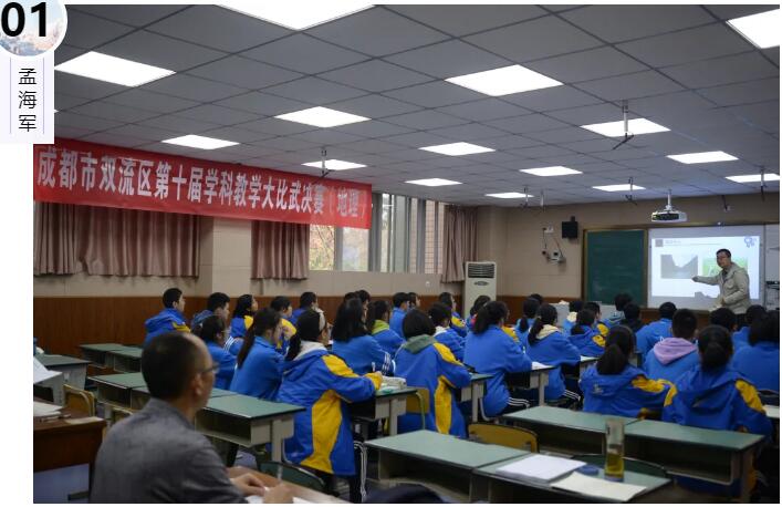 本次地理学科比武决赛分为三个环节:备课、上课、答辩。备课环节,参赛教师现场抽取课题,然后用60分钟封闭备课。上课环节,参赛教师上课前与学生交流5分钟,上课时间为40分钟。答辩环节,由专家针对教育教学等问题及时提问,限时5分钟。来自双流区各中学七位青年教师孟海军、雷涛、陈文、黄强、蒋瑛、李焕永、郝碧娅为大家奉献了各具特色、精彩纷呈的教学盛宴,让我们一起来领略参赛教师的精彩课堂吧!