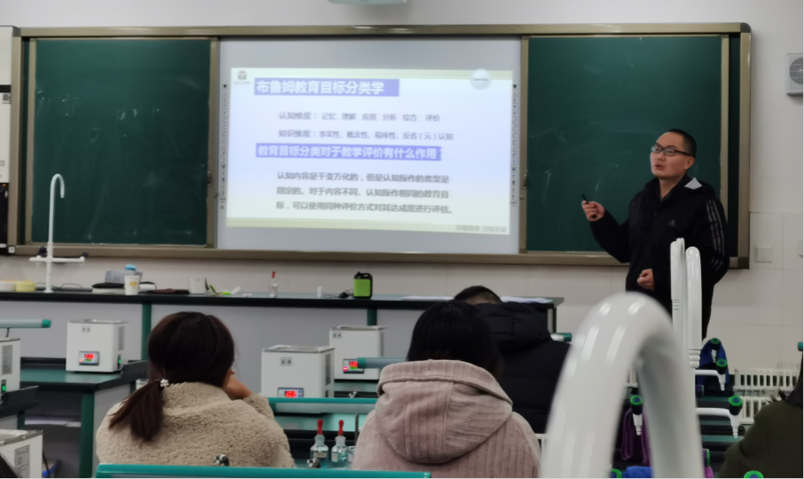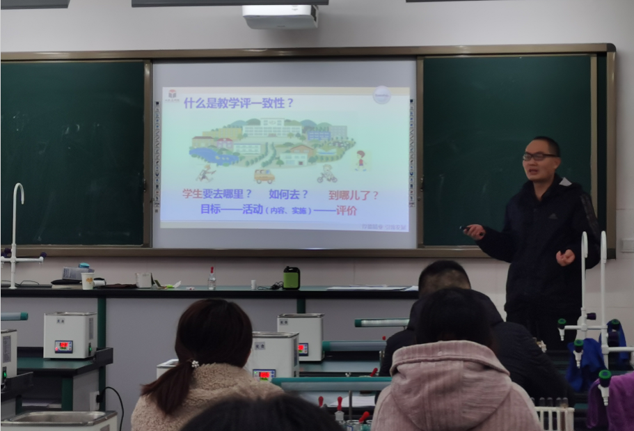 杜老师先对“教学评一致性”的内涵进行了解读:学生要去哪儿?如何去?到哪儿了?这就好比教学的目标,实现目标所需要开展的活动(内容、实施环节),以及对教学效果的评价。在双流区启动了“基于标准的‘教学评一致性’实践研究”的市级总课题下,棠湖中学生物组也申报了区级子课题参与其中研究,并一直致力于将潜心研究的相关理论应用于实践。