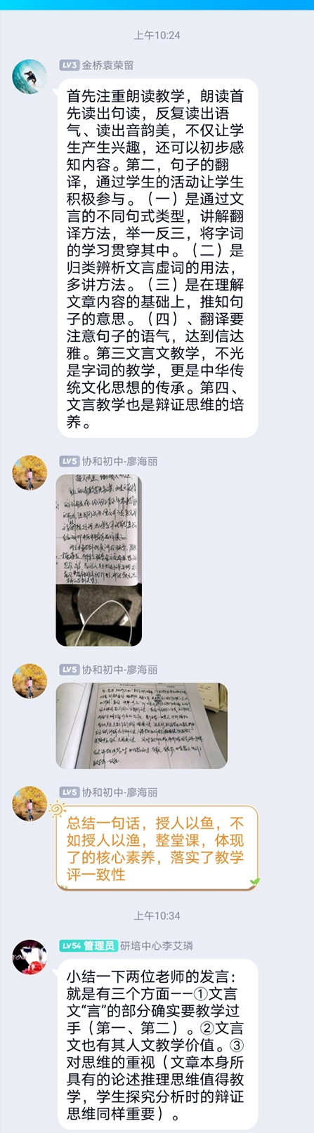 针对“赶课”与“用好教材”的矛盾,金桥初中的袁荣留老师和协和初中的廖海丽老师一致认为:文言文“言”的部分确实要教学过手;文言文也有其人文教学价值;文言文教学也要重视思维能力的提升。
