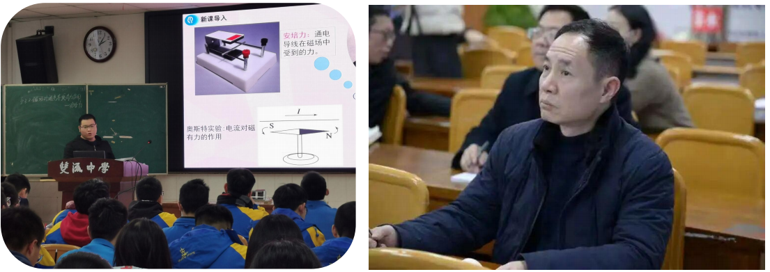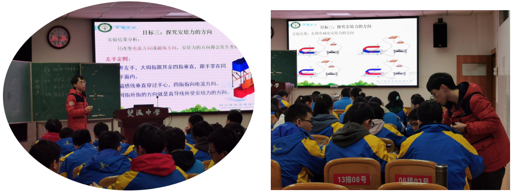 其他三位老师围绕:认识安培力、安培力的大小、安培力的方向这三点,针对《磁场对通电导线的作用——安培力》一节,叙写了各自的说课内容。他们在新的物理课程理念下施展想法,在充分考虑课标、学情的层面上在进行教学设计。将 DIS 实验、投屏技术等现代化信息技术融入课堂中,展示了双流区新物理教师的教学扎实基本功。