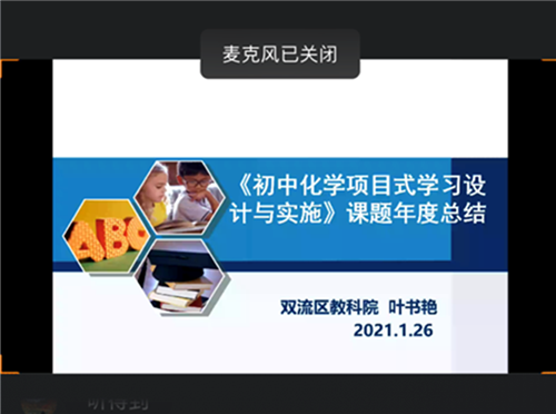 1月26日晚上,双流区初中化学市级课题《初中化学项目式学习设计与实施研究》年度总结通过网络顺利进行。